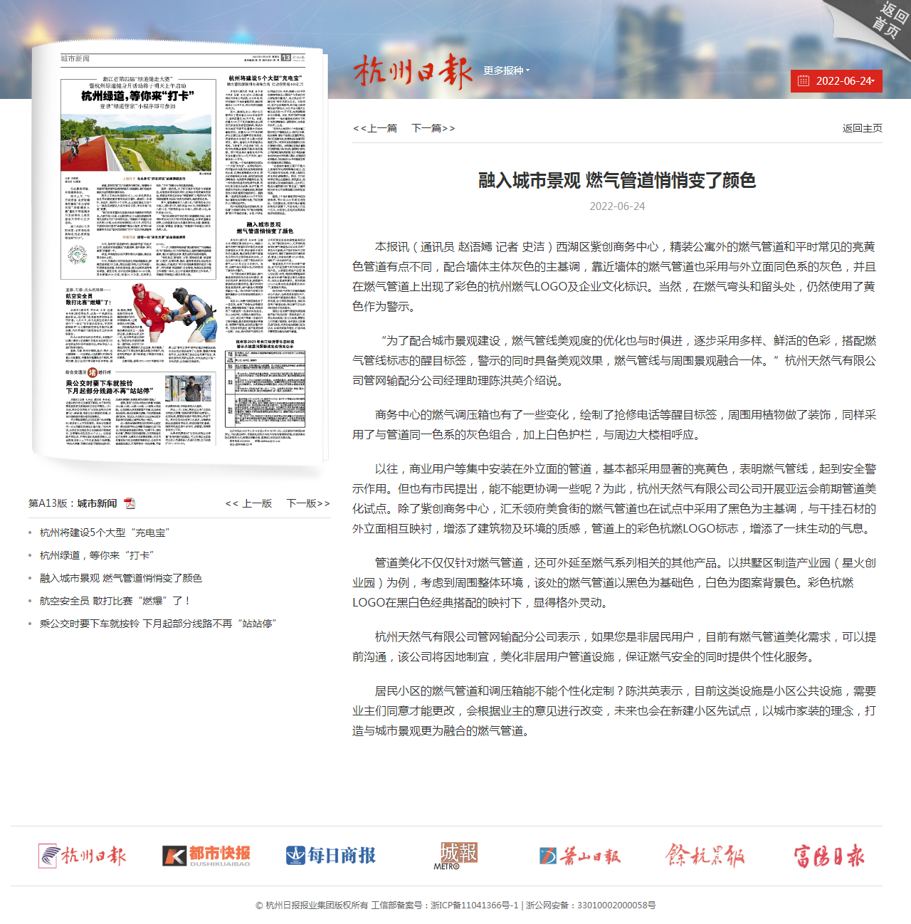 “為了配合城市景觀建設(shè),燃?xì)夤芫美觀度的優(yōu)化也與時(shí)俱進(jìn),逐步采用多樣、鮮活的色彩,搭配燃?xì)夤芫標(biāo)志的醒目標(biāo)簽,警示的同時(shí)具備美觀效果,燃?xì)夤芫與周?chē)坝^融合一體。”杭州天然氣有限公司管網(wǎng)輸配分公司經(jīng)理助理陳洪英介紹說(shuō)。