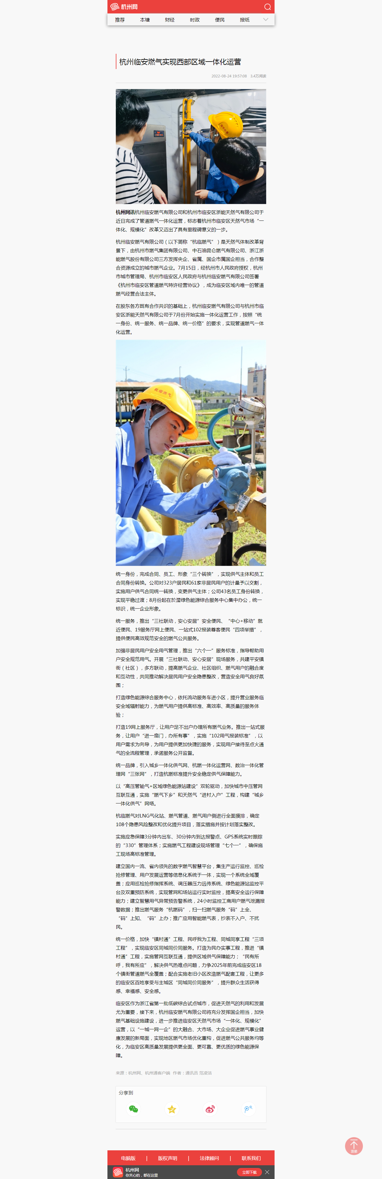 在股東各方既有合作共識(shí)的基礎(chǔ)上,杭州臨安燃?xì)庥邢薰九c杭州市臨安區(qū)浙能天然氣有限公司于7月份開(kāi)始實(shí)施一體化運(yùn)營(yíng)工作,按照“統(tǒng)一身份、統(tǒng)一服務(wù)、統(tǒng)一品牌、統(tǒng)一價(jià)格”的要求,實(shí)現(xiàn)管道燃?xì)庖惑w化運(yùn)營(yíng)。